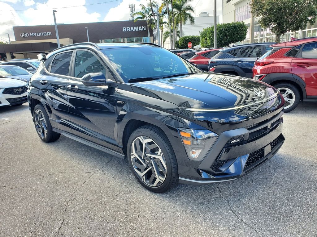 Braman Miami is Proud to offer you this Exceptional 2025 Hyundai Kona, Appointed with the N Line S Trim and is finished in Abyss Black Pearl over Black Artificial Leather inside And it is ready for your consideration today! Recent Arrival! 2025 Hyundai Kona N Line S I4 8-Speed Automatic FWD